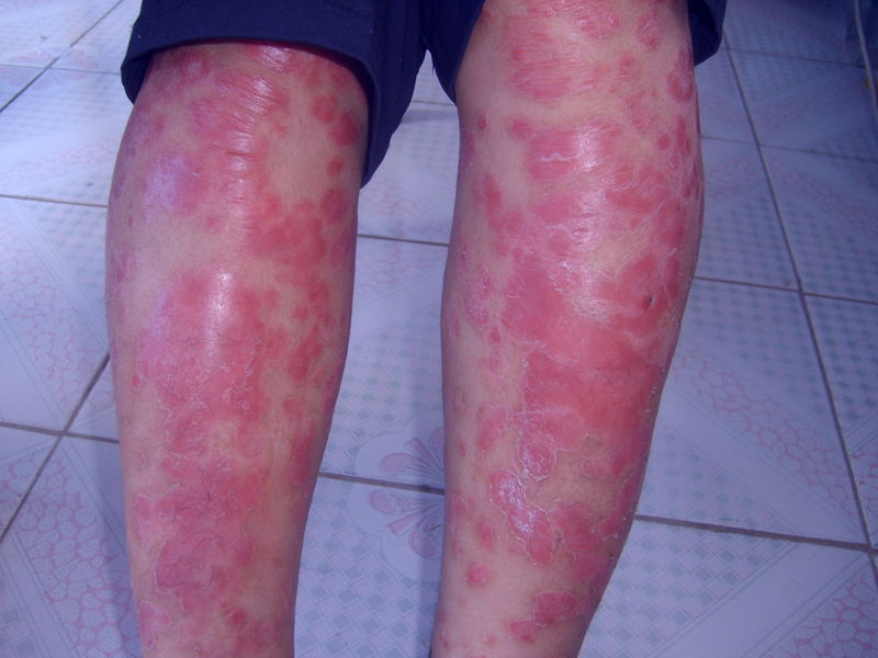 三、有的牛皮癣患者症状会呈现为红色,这样的牛皮癣人们称之为红皮型牛皮癣。一般表现为皮疹带有少量的,附带有湿性鳞屑,或初起为小脓疱。